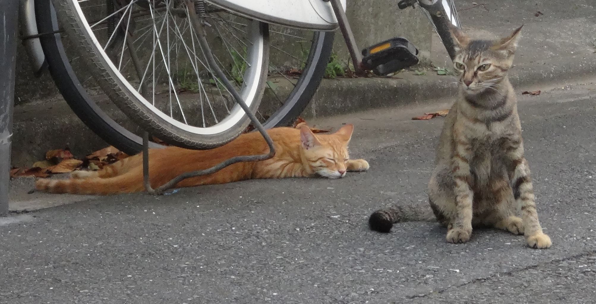縄張り際で敵猫に目を光らせる母猫と、熟睡する参瑚。