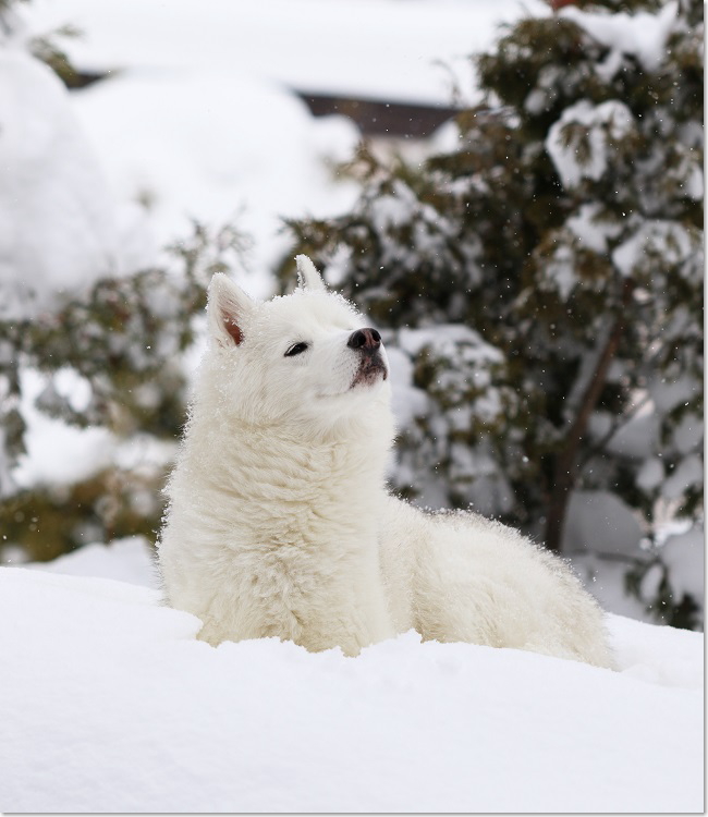 銀坊はゴハンのあとにヨーグルトをいただき、その汚れたおクチをヒトの服になすり付けて拭いていたのだが、この数年は新雪の中におカオを突っ込んで自ら拭いている!