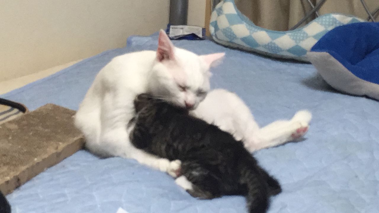 寝てる時雉にグルーミングを仕掛ける麿白先生。