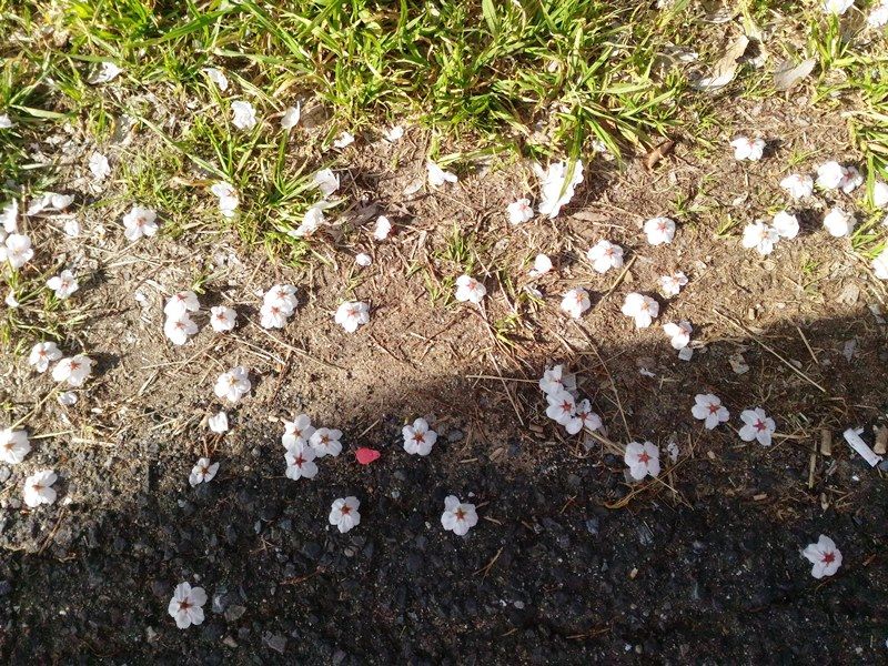 散歩道 街路樹の隙間に内緒で蒔いた菜の花もやっと大きくなりました 堤防の坂道の桜 満開 不思議なのは、満開になったばかりの桜の根元に 普通ならまだ散るのは早すぎるはずの桜の花が 花びらを散らすのではなく、花一輪ごと無数に落ちていること さあ、週末お花見だ 花見の行き先を決めなくては にほんブログ村