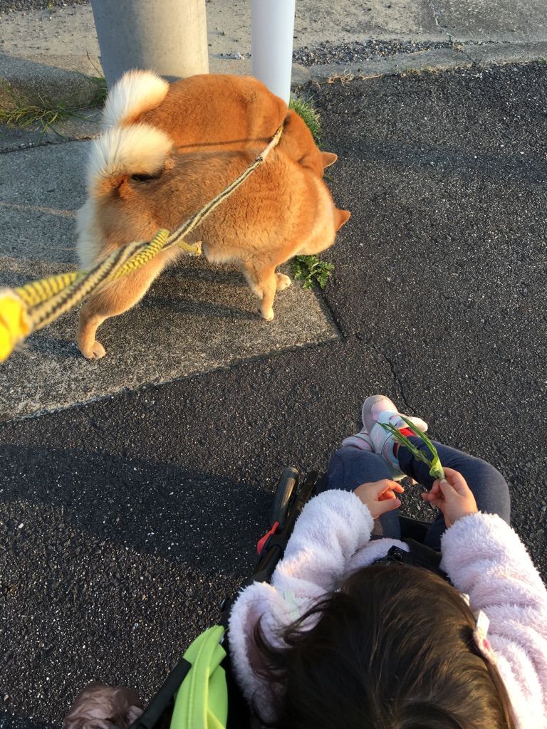 孫は草を取って、みな柴に食べさせようとしていました(笑