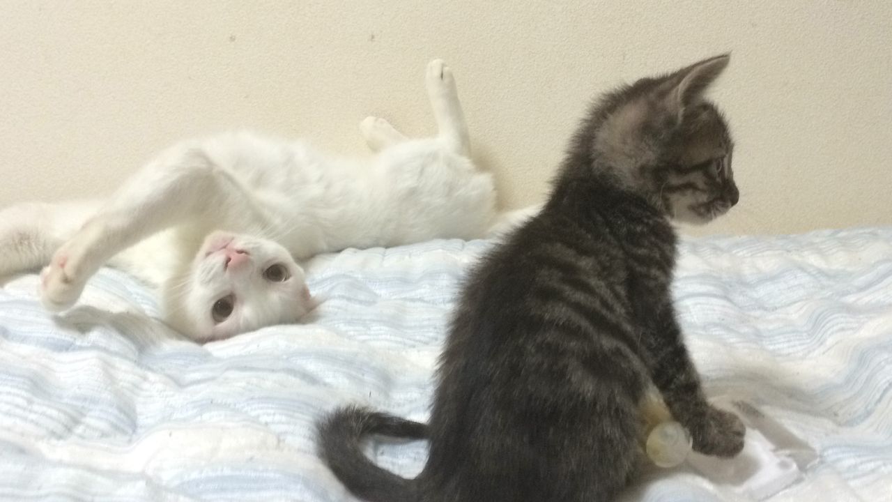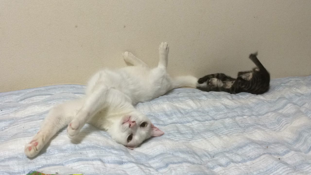 こんな体勢で子猫をあやす母猫は麿白先生だけだと思います。
