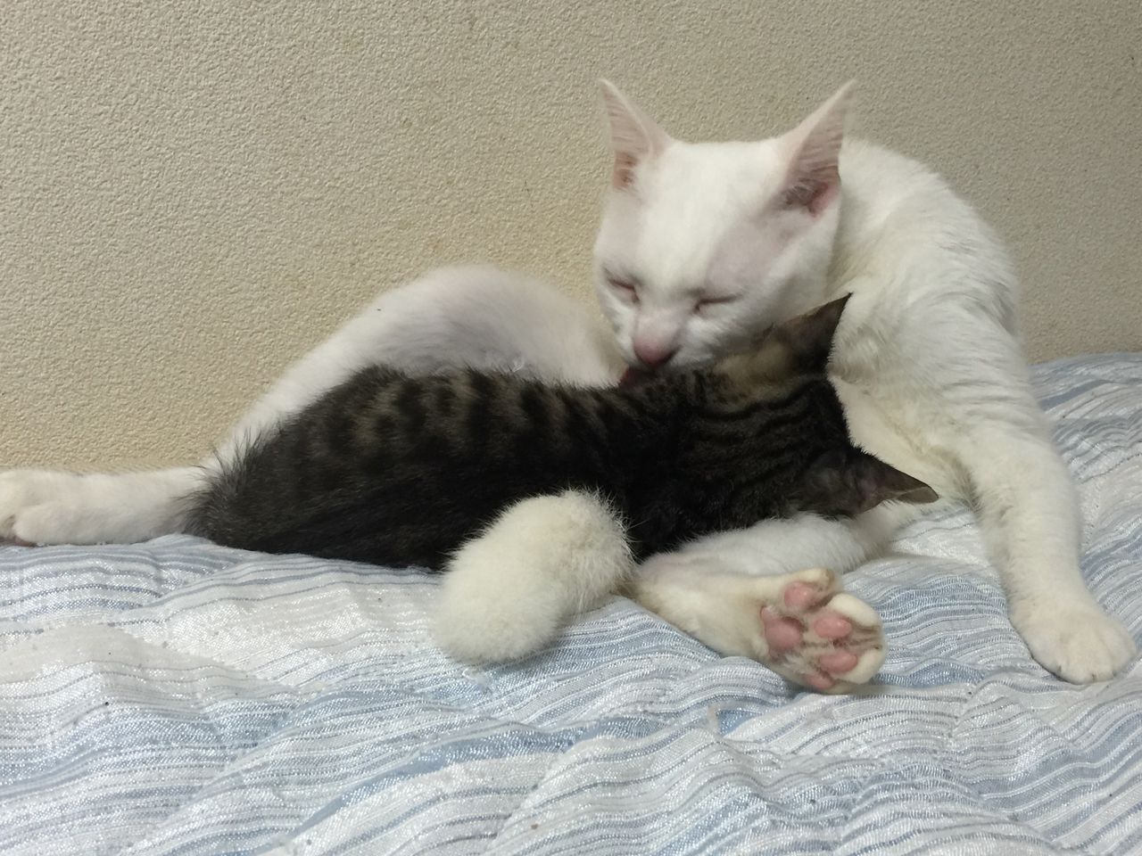 この腹で眠る斗雲をグルーミングする麿白先生。