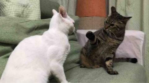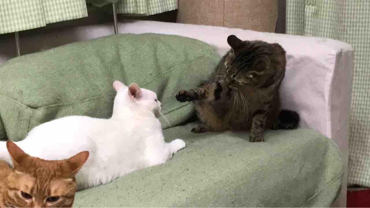 自分が育てた時雉に全く歯が立たず、前脚一本で制せられる麿白先生。