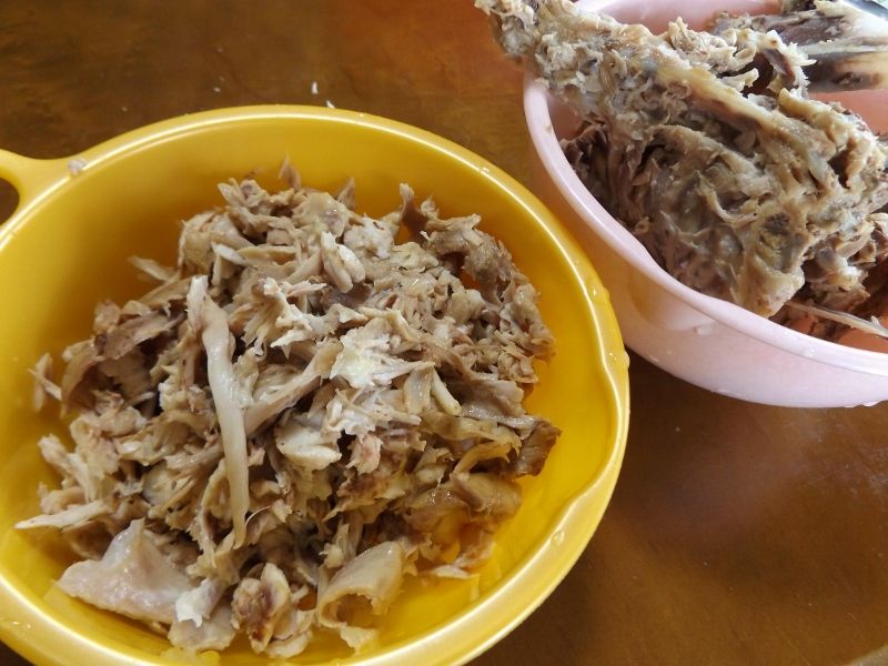 出汁をとった親鶏のガラは、まだまだ身が付いてるので、ほぐしてワンちゃんのトッピング素材にします。