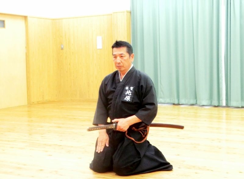 他の先生は、正面に対持していて、後ろへ向く際、体の中心軸を右へずらさない。要するに、左足を右足の直ぐ右に送り、右足を少し左に開くことで、体の中心軸が相手と正対した状態となる。そこで、相手に向き直り、左足を左に開くことでひと身相手より左に位置することになるが、そのまま相手と正対してるものとして切るというもの。よって、開始線よりひと身だけ左に位置しているため、元へ戻る際、ひと身分だけ右後ろへ退くというもの。