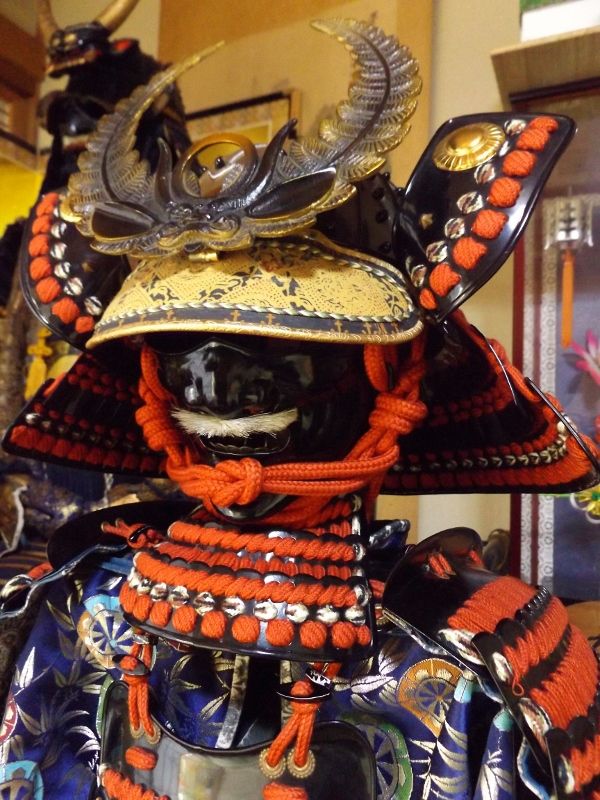 当世具足君:赤糸威伊予札二枚胴具足、但し兜前立は徳川家康の押歯朶前立に作り変えています。