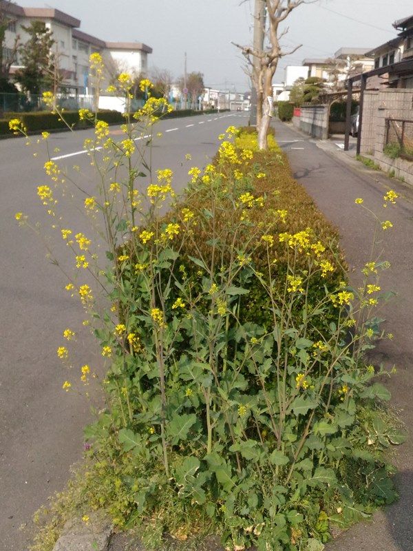 道路の植え込み五か所ほどには育ったけど、堤防の坂道は雑草が手ごわく菜の花の付け入るスキがないのかも