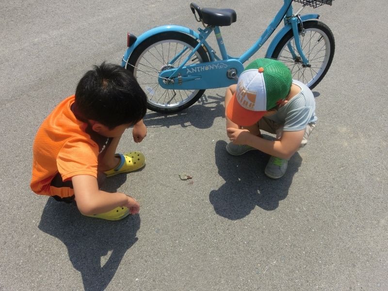 サイクリングにも出かけたけど、道路にミシシッピーミドリガメを見つけて何か作戦を練ってますよ。
