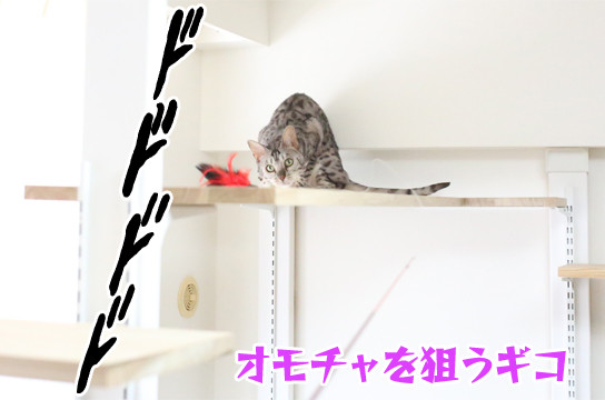 羽根の猫じゃらしをキャットタワーウォークの上で狙うギコ