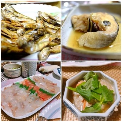 ハタハタ焼き、真鱈の煮つけ、昆布締めの刺身、すだれ麩の卵とじ。