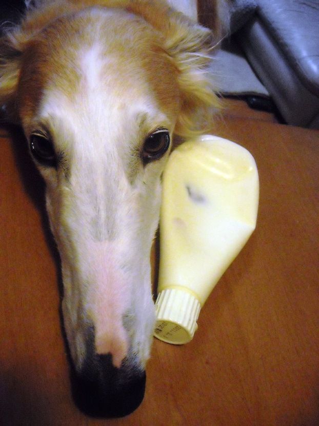 テーブルにあるマヨネーズのボトルとボルゾイの区別がつきますか