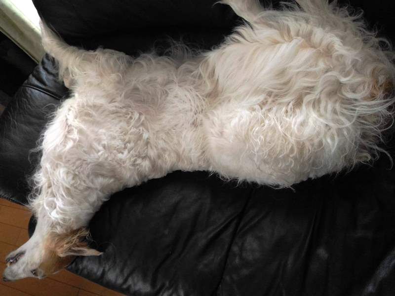 夕方仕事を終えて部屋に戻ったら、彼らがシャンプーされてソファーに転がっていた