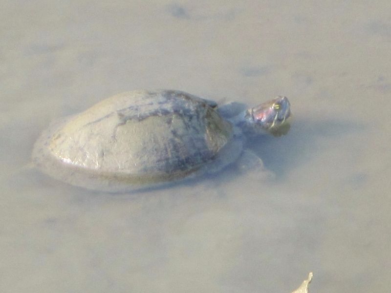 ミドリガメは、泥の中へ退避のようです。