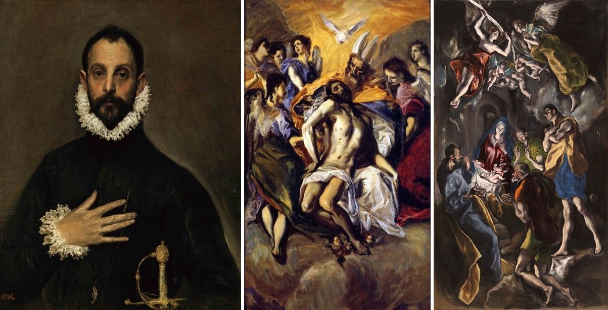 エル・グレコ:左から,胸に手を置く騎士,羊飼いの礼拝,三位一体