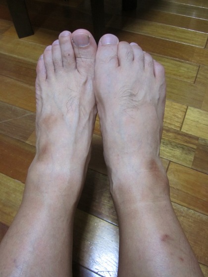 右足は、やはり左足より少し腫れ気味だね。 既に痛みはひいたので、先日のは挫いてたんでしょう。 こうやって見ると、血管も分から無いようにパンパンしてたもんね。 汚い足で、失礼っ。 めまい治療にもお散歩が良いというので、今日は絶好の曇り空なのでブラブラしました。 既に1万歩超えで、体調も良いです。 家に帰り着くと、凄い通り雨が。 濡れずにすみました。