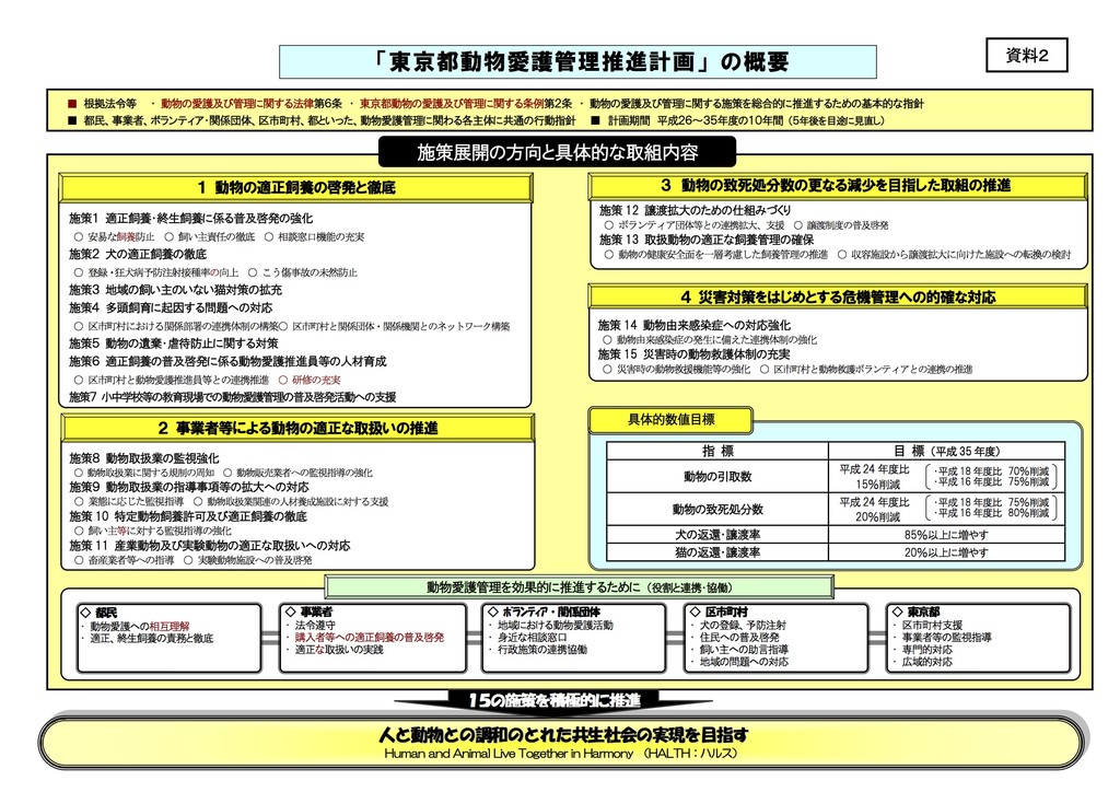 東京都の計画では動物の適正飼養や殺処分の減少、災害対策の大きな3つの柱があり、そのうち殺処分の減少に関連する項目について数値目標がある。