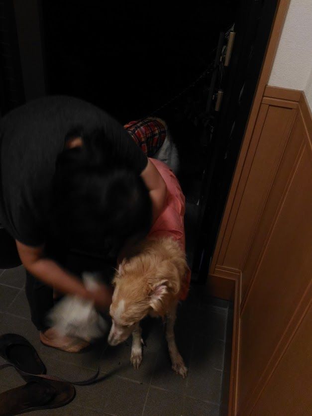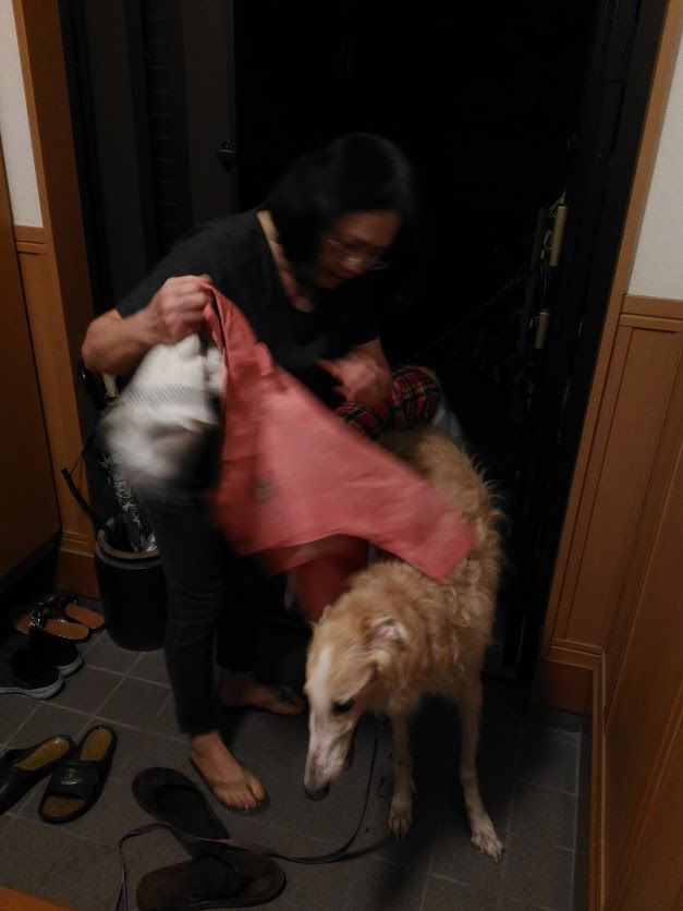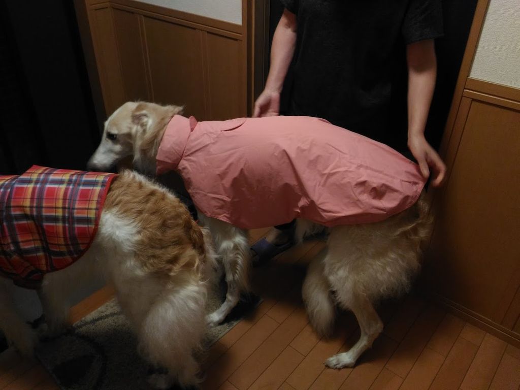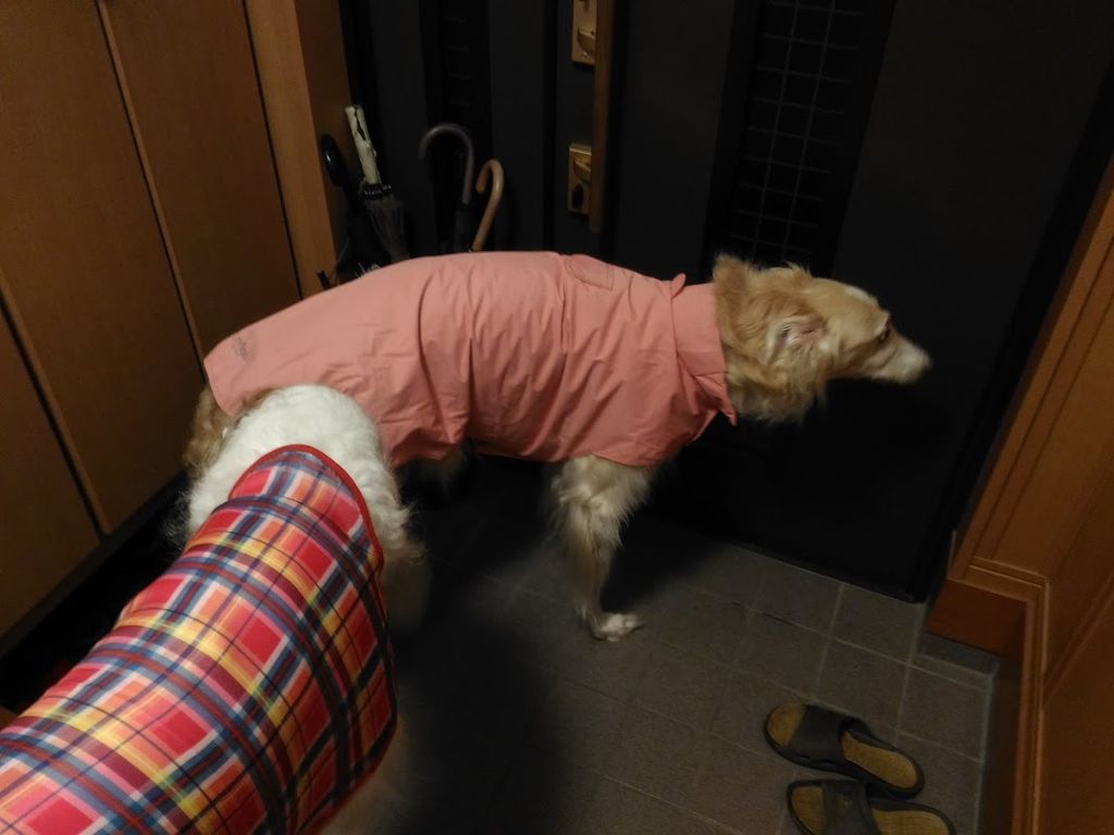 散歩から帰ってきて、レインコートを脱がせてもらうまで、緊張が続きます