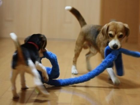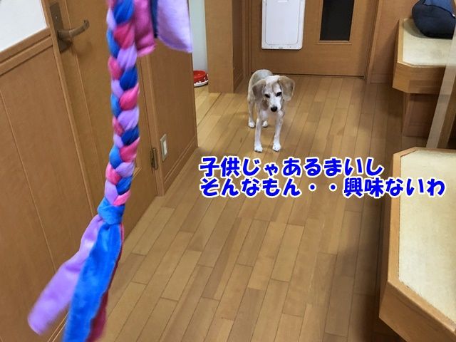 こんなこともあったのですがしばらくして真ん中をあたしが持って三人で引っ張りっこじゃないと遊ばなくなってそのうちにこのロープに2頭とも見向きもしなくなりました(泣