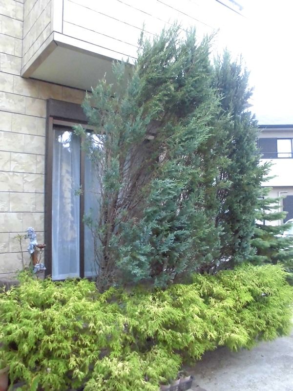 リビングのはきだし窓の植木コニファが台風で一本曲がってしまった