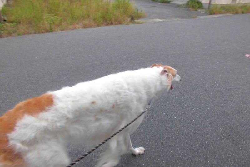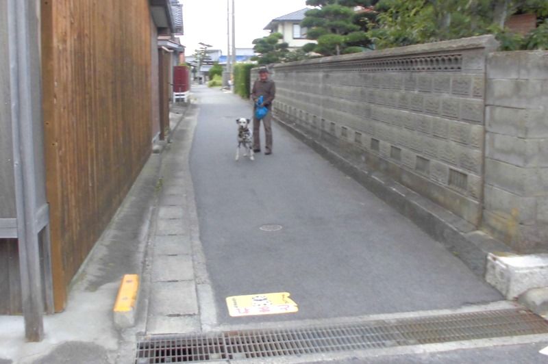 角を曲がった向こうから、やる気を出したダルメシアンが、おじさんをグイグイ引っ張って向かってきた