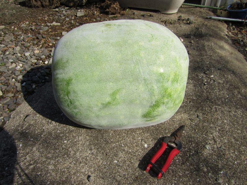 今日、娘が来るかもと言うので、持たせるためのでっかい冬瓜を収穫しました。