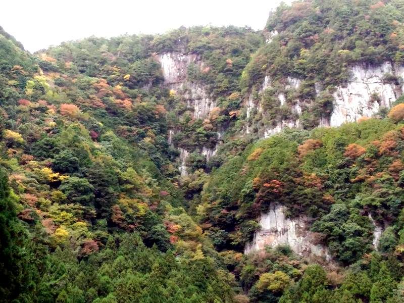まだ早くやっと紅葉しかかったところ、山の上部が彩られる