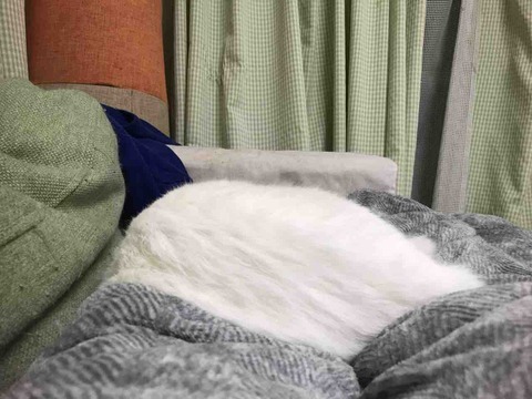 日中、ヒーターの温風に当たりながら放熱謎寝相の麿白先生の姿が!