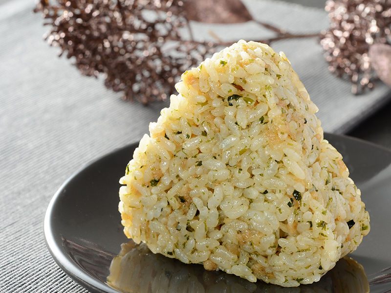 白だしで炊いたご飯に、「天かす」「青のり」「天つゆ」を混ぜ込んで握ったおにぎり。