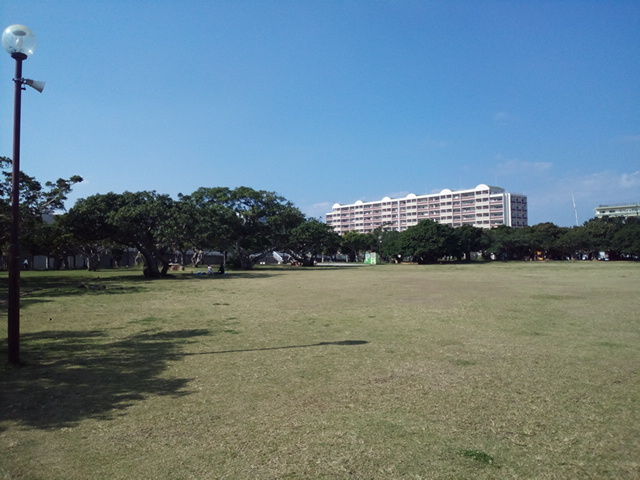 那覇市内の公園で果物を食べながら一休み。