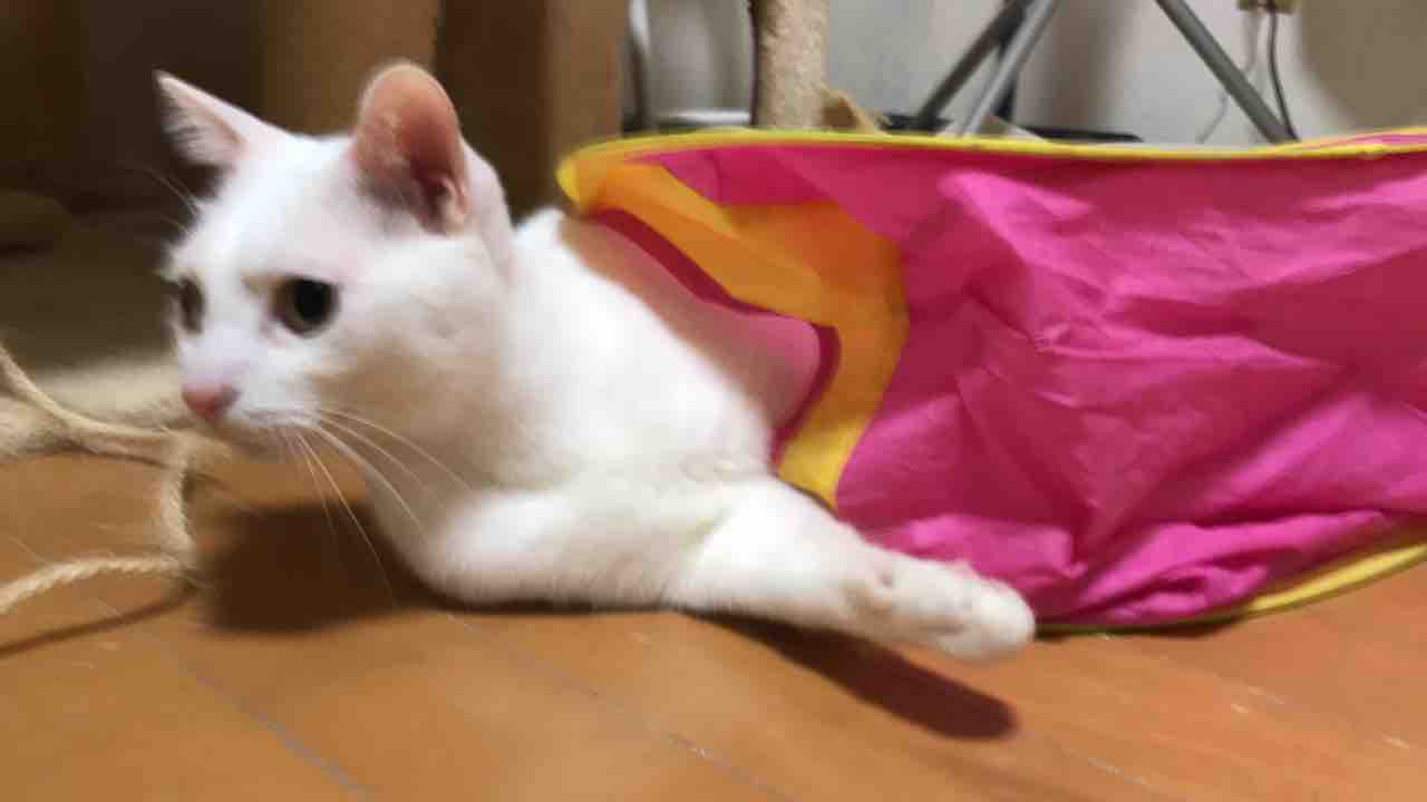 いうてももう地球年齢5歳なので前ほどのキレみたいなのはないのは当然ですし、体力の低下もあるでしょうし。テンションあがってわさわさ転がるだけなので、こういう猫おもちゃでの遊びくらいは静観しています。