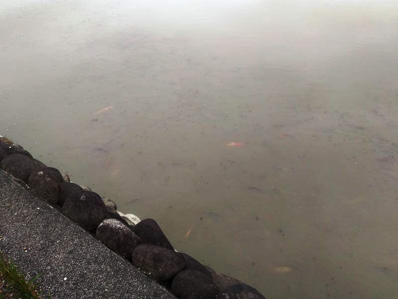 濁り水の中、鯉達は浅くなった水に背中を出しそうになっている