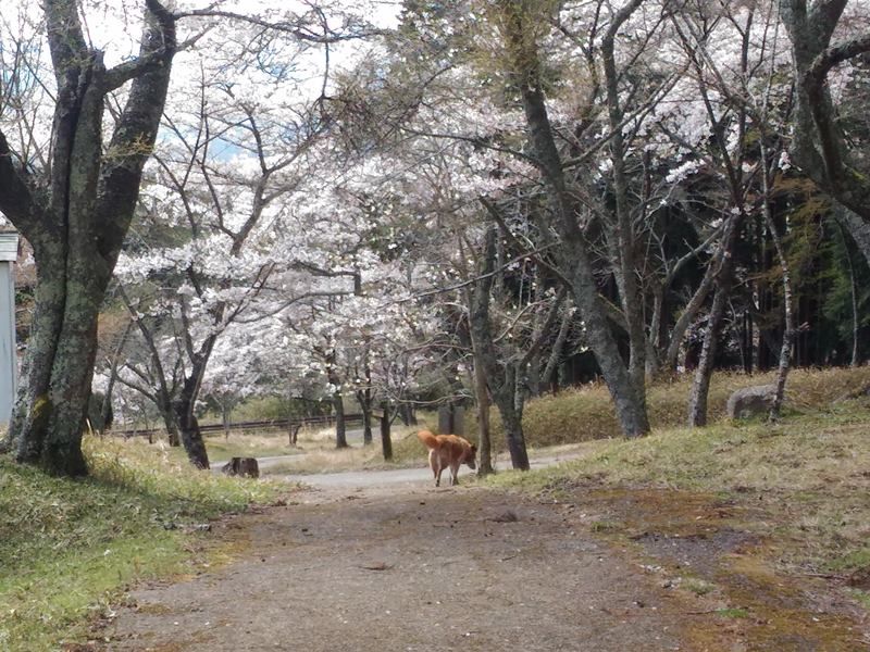 大木の下に係留されている老柴犬がユリさん陸ぼんに向かって吠える