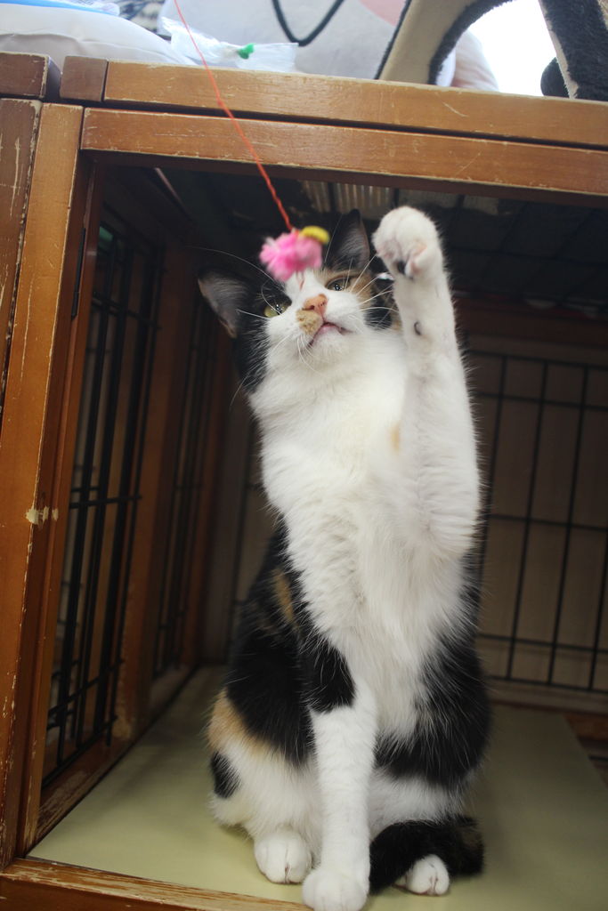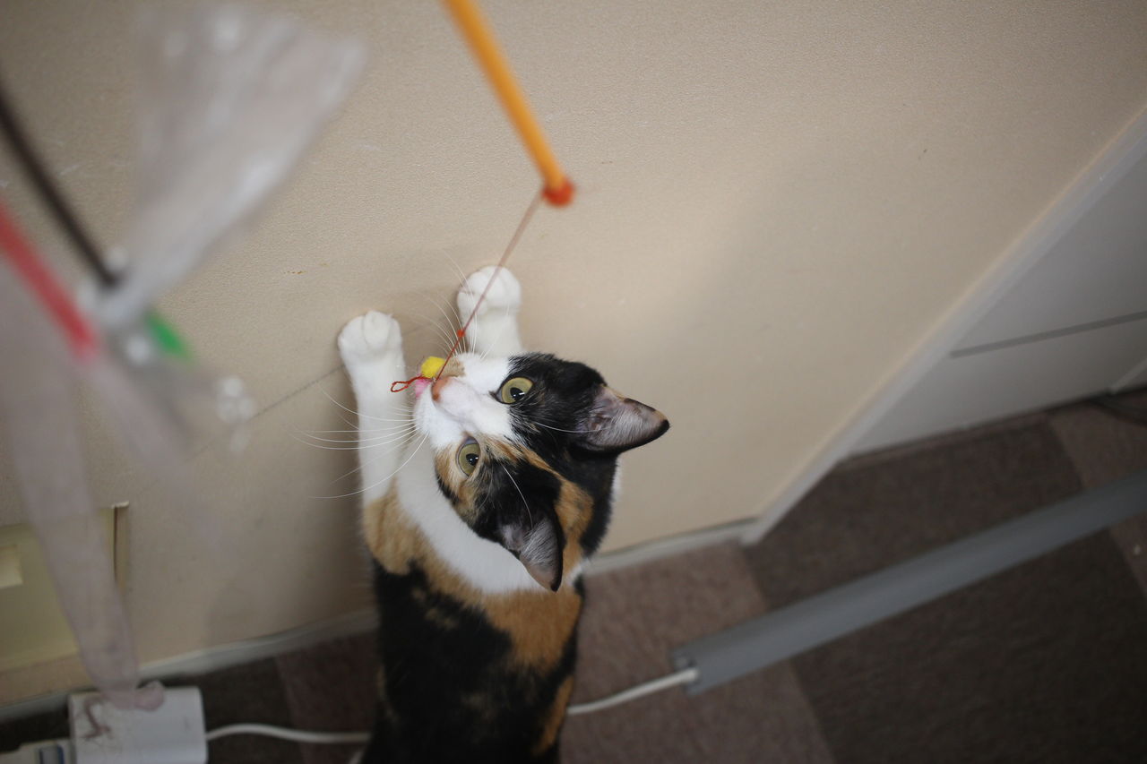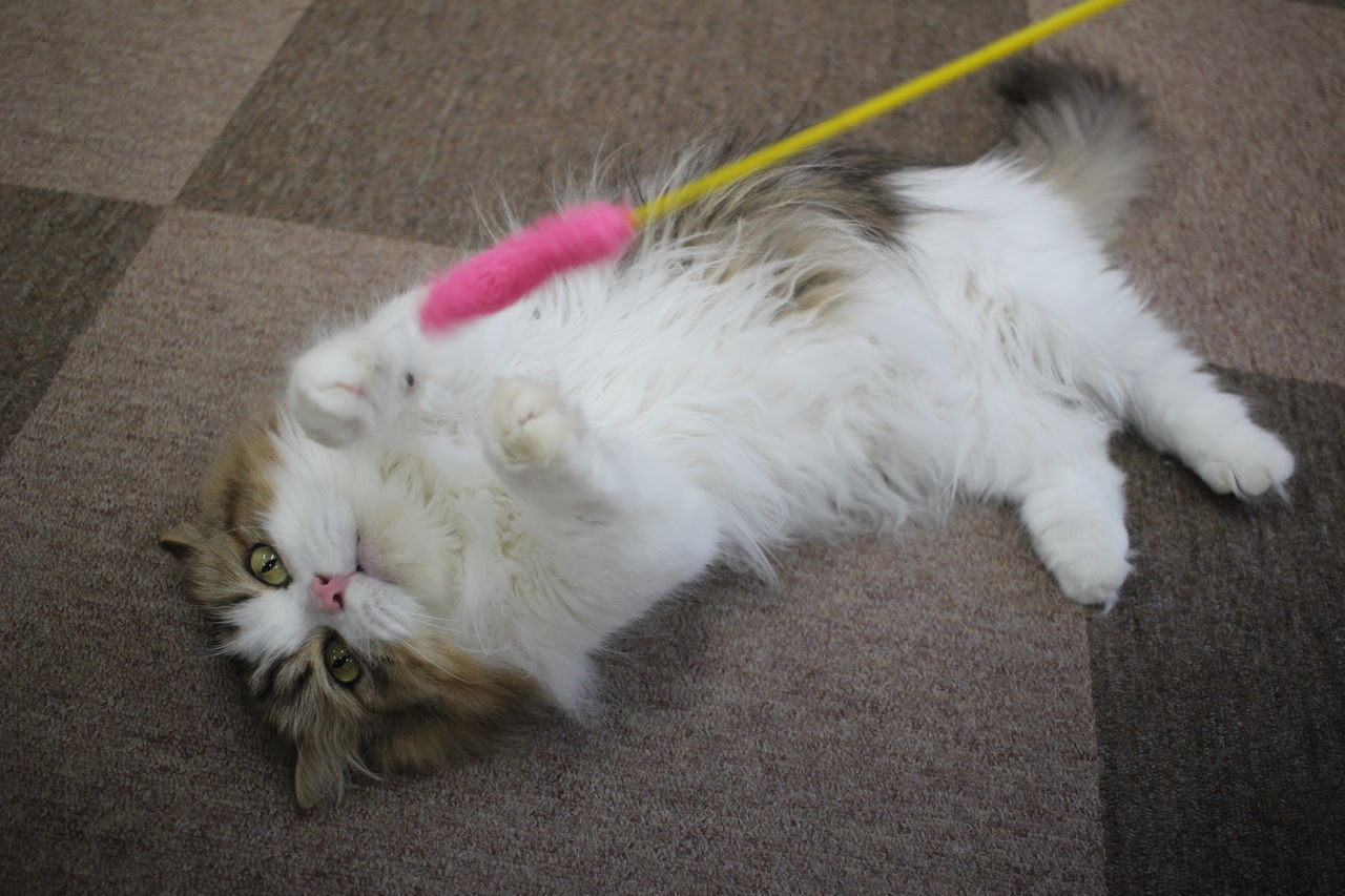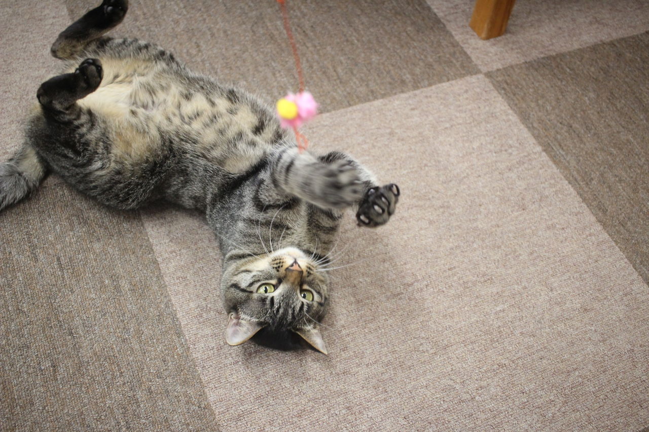 彼はあまりおもちゃで遊んでいるイメージがなかったのですが、今日遊んでくださったお客様のねこじゃらしの使い方がプロだったのか、ころころと転がりながらじゃれていました!