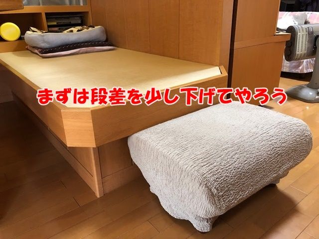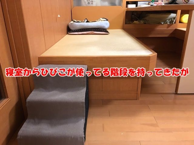 ベットに飛び乗る時に時々失敗するからお尻に手を添えて介助したり抱いてベットに乗せたりベッドから降ろしたり・・