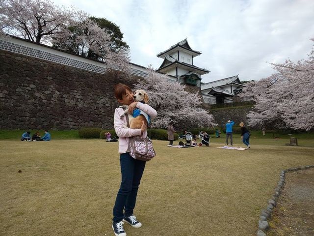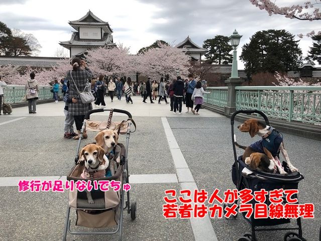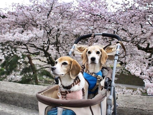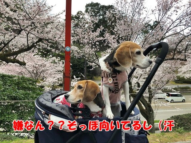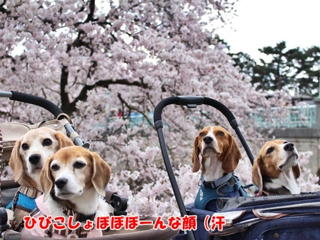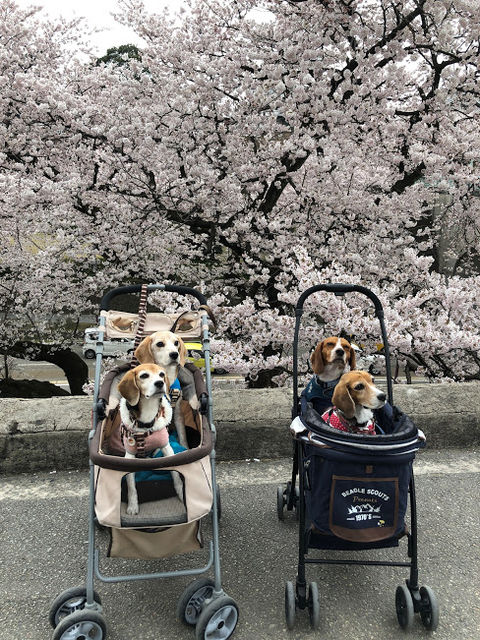 ビーグル4頭がカートでお花見は誰が見ても可愛いみたいでどれだけの人がスマホで撮影してたものか。