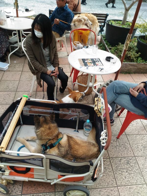 思いっきり食べ歩きした後で、テラスで遅いランチを食べる