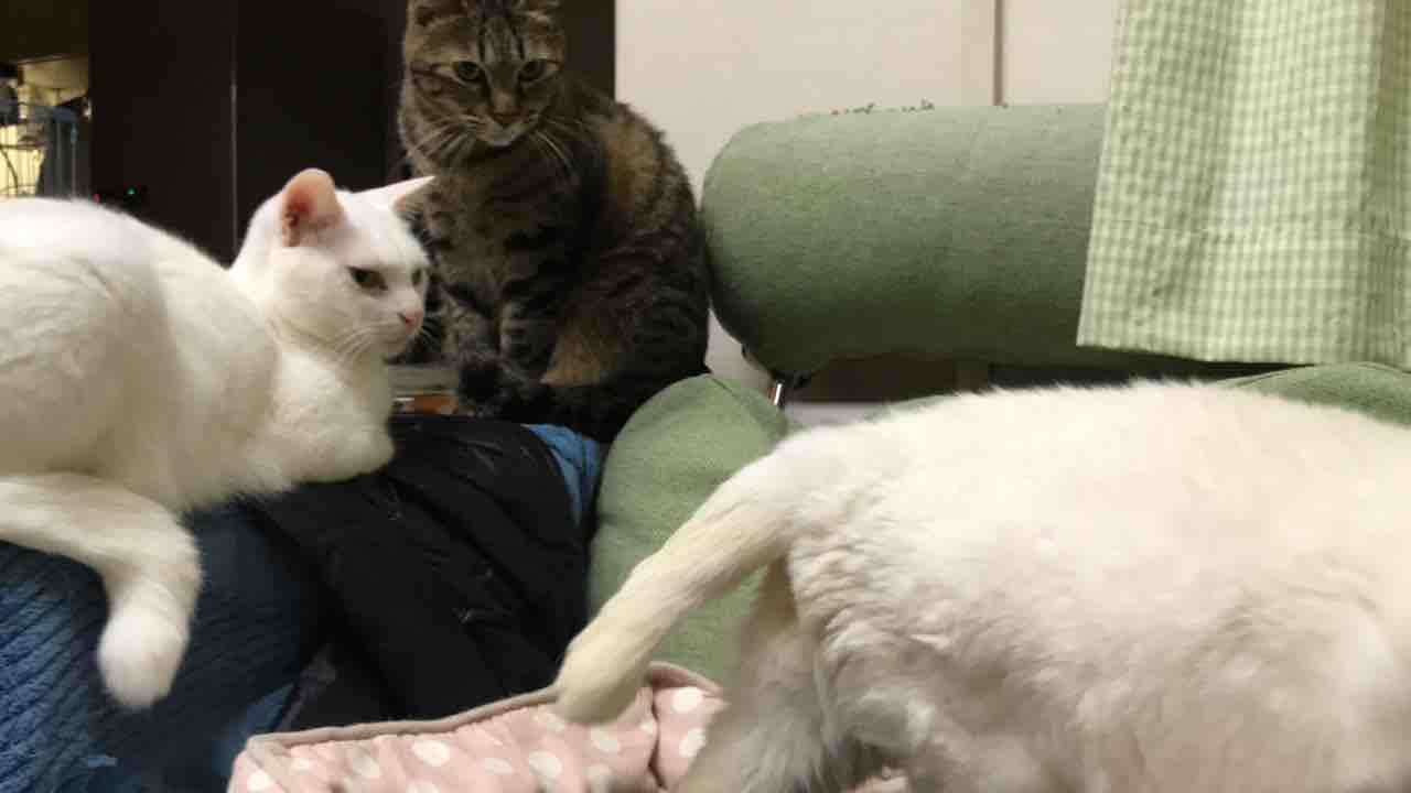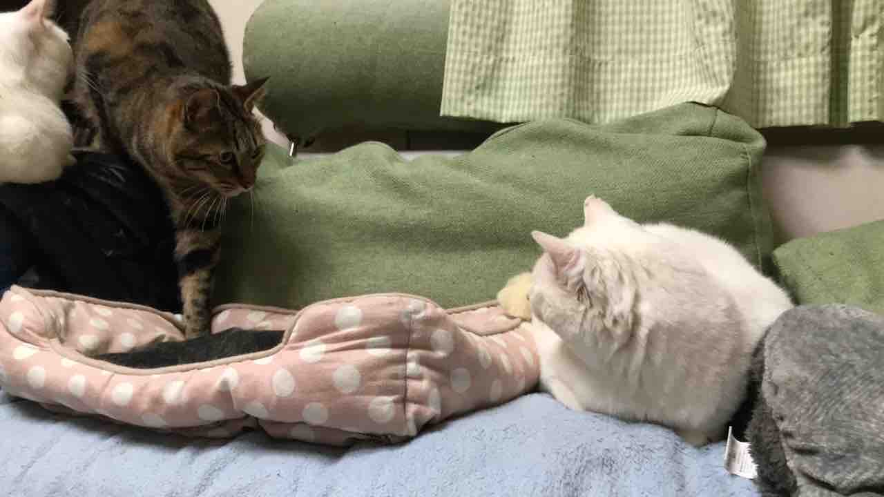 猫部屋なら強気で突進するところ、アウェーゆえか麿白先生と時雉の前で借りてきたたぬきの暁璘。