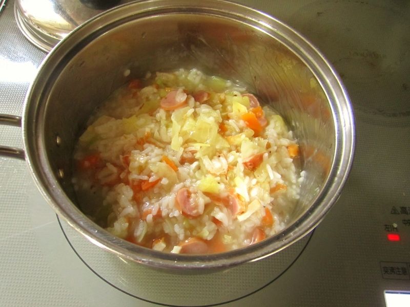 あり合わせの物(ご飯、ウインナー、ちくわ、キャベツ、ニンジン、鰹節)で作ってみました。