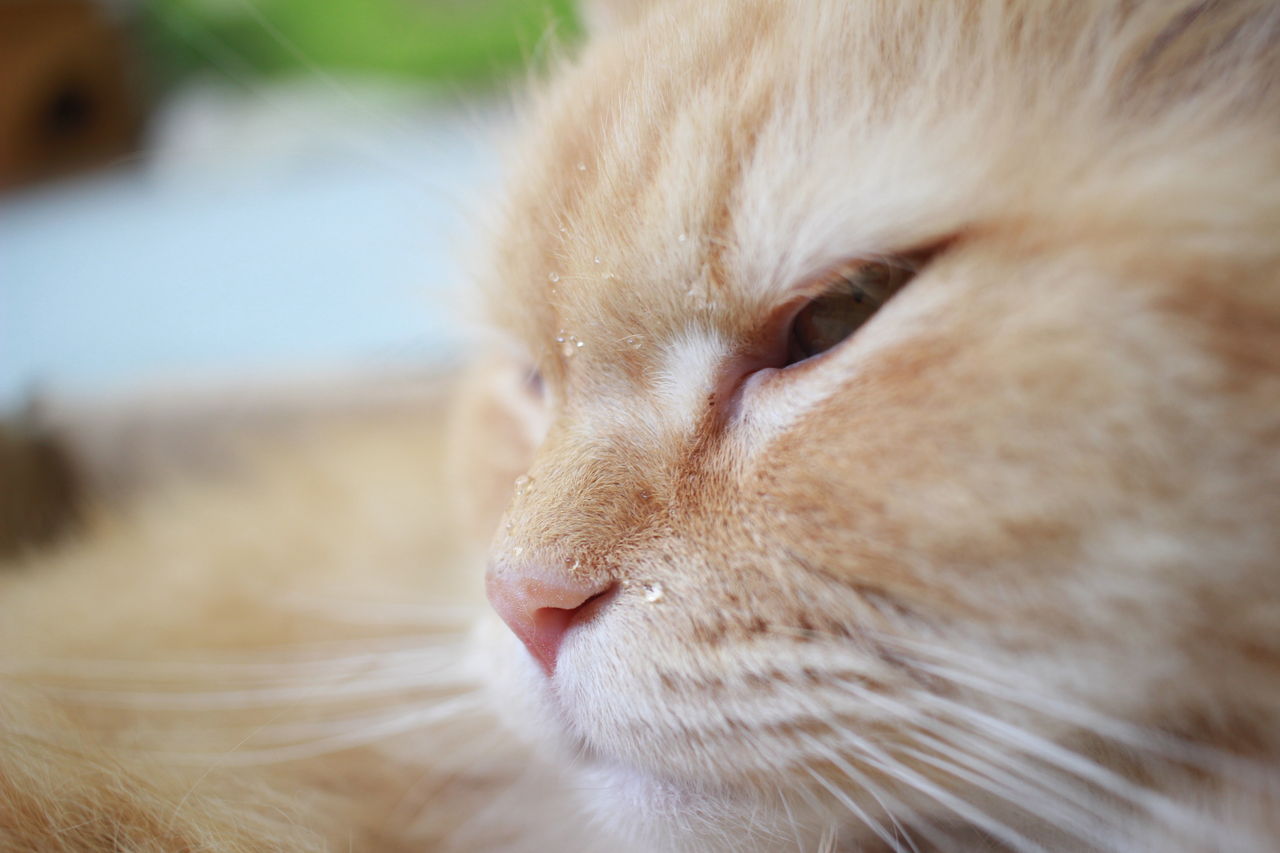 部屋から飛び出し、毛づくろい中のちょびさん。