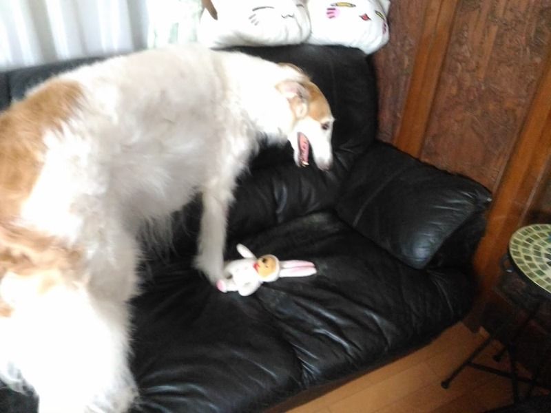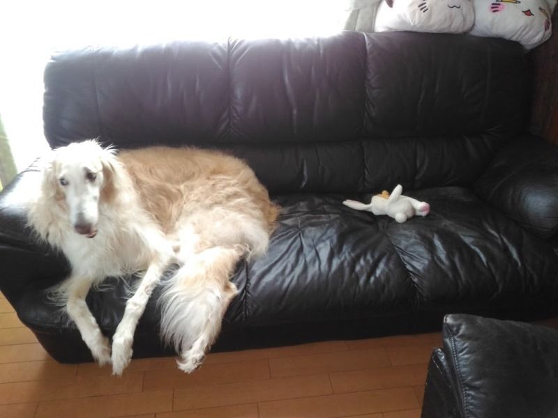 ソファーの上のぬいぐるみを前足でチョイチョイと払いのけて