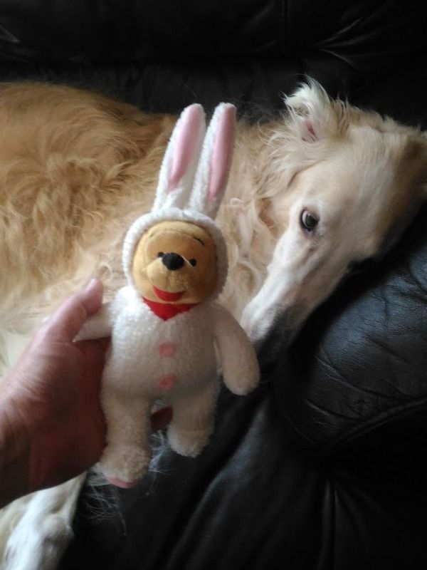 ソファーに上がって、ぬいぐるみの周りを2周回ります