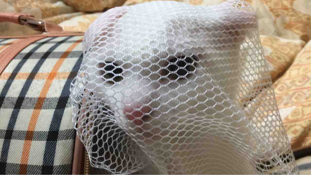 いい子にしてるのに、なんでぼくが洗濯ネットに入れられてるんだい。