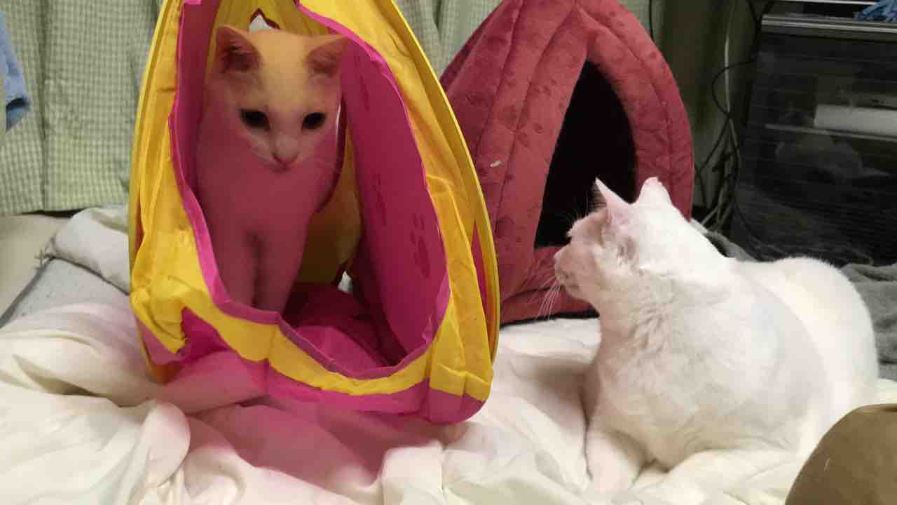 でかい顔する白たぬきを後ろで見るウチューネコチャン。
