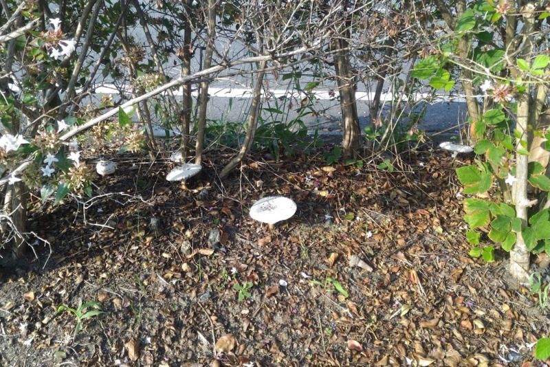 街路の植え込みの中に、白いキノコ多数発見