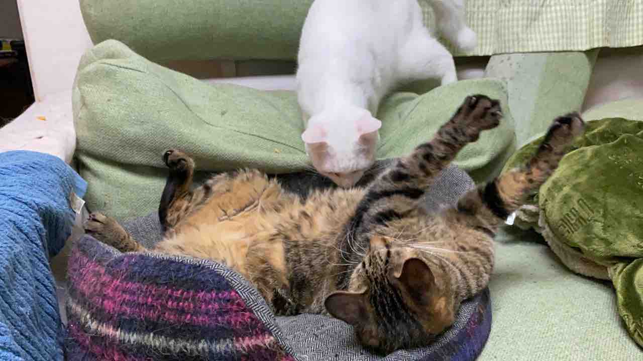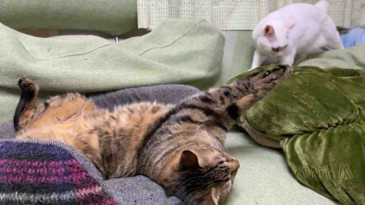 麿白先生は他猫が珍妙な寝相をしてると心底不思議そうな顔をするという理不尽猫です。