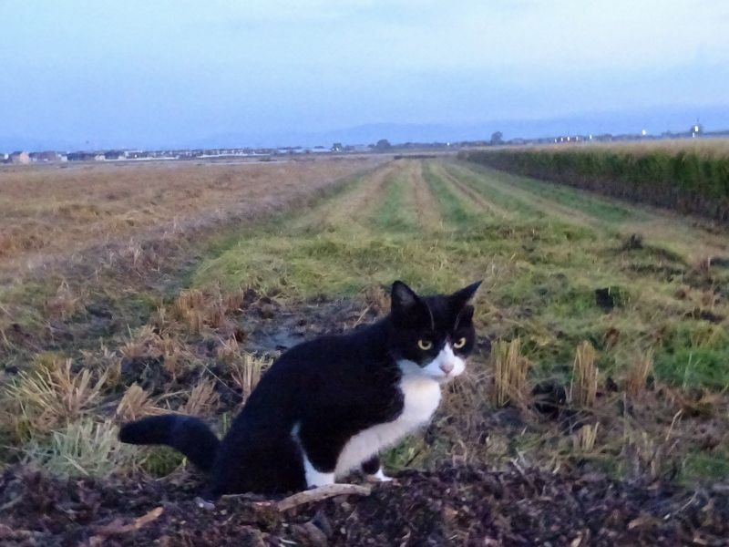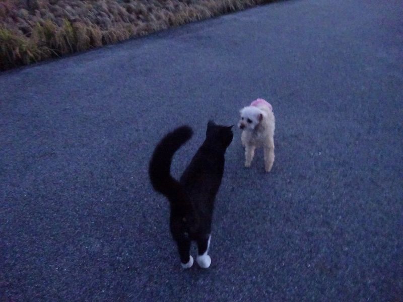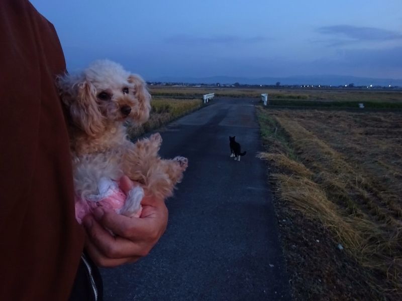 朝の散歩へ行こうとしたら、黒ちゃんが着いて来てしまいました。