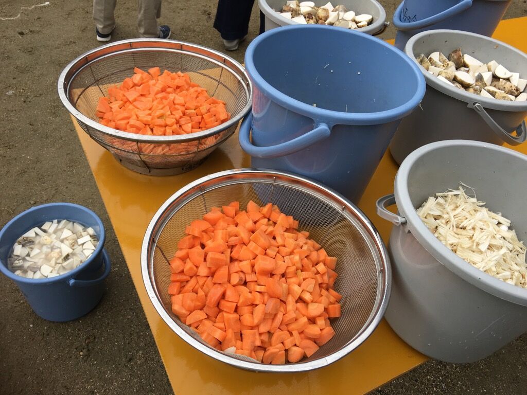 収穫物で大鍋を煮て