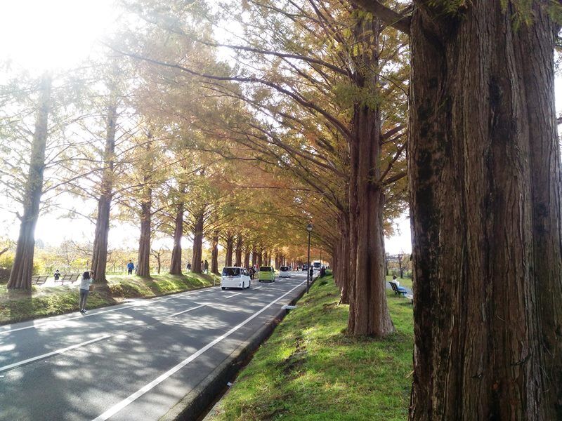 駐車場から屋台街を抜けて、並木の通りに出ると