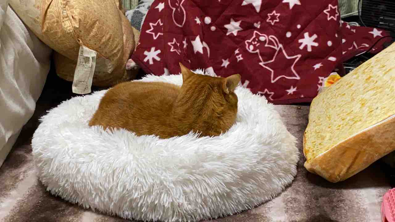 お贈り頂いた新しいもふもふクッションに沈む麿白先生。